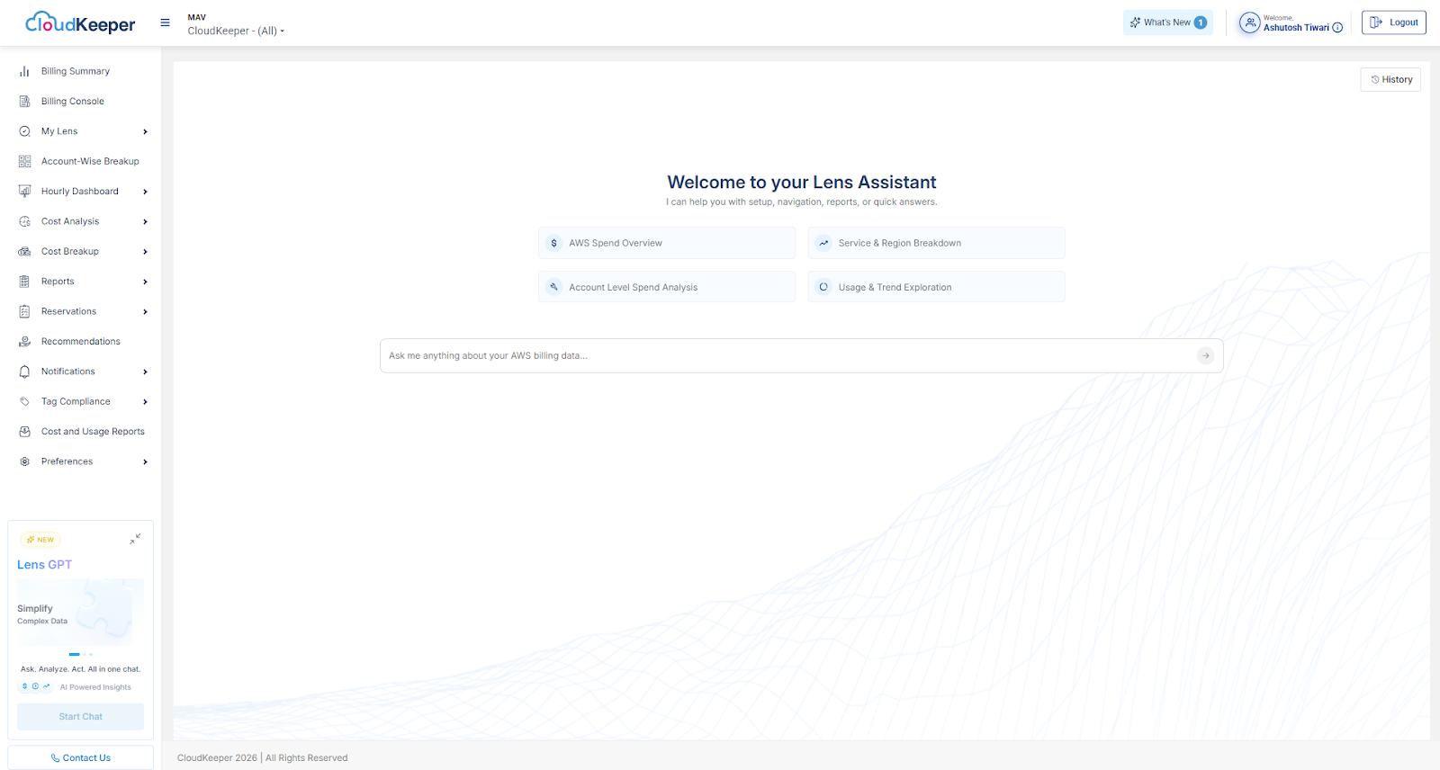 LensGPT delivers natural language querying, contextual explanations that interpret what the numbers mean, and conversation history management that allows users to view, rename, or delete past chats seamlessly. The assistant operates within CloudKeeper - Lens, ensuring a distraction-free and uninterrupted experience aligned with the product’s design standards. By reducing dashboard dependency and simplifying cost interpretation, LensGPT improves productivity, lowers the learning curve for new users, and accelerates AWS billing insights. Currently, the feature supports AWS billing data only and does not include cost optimization recommendations or RI/Savings Plan guidance in this release.