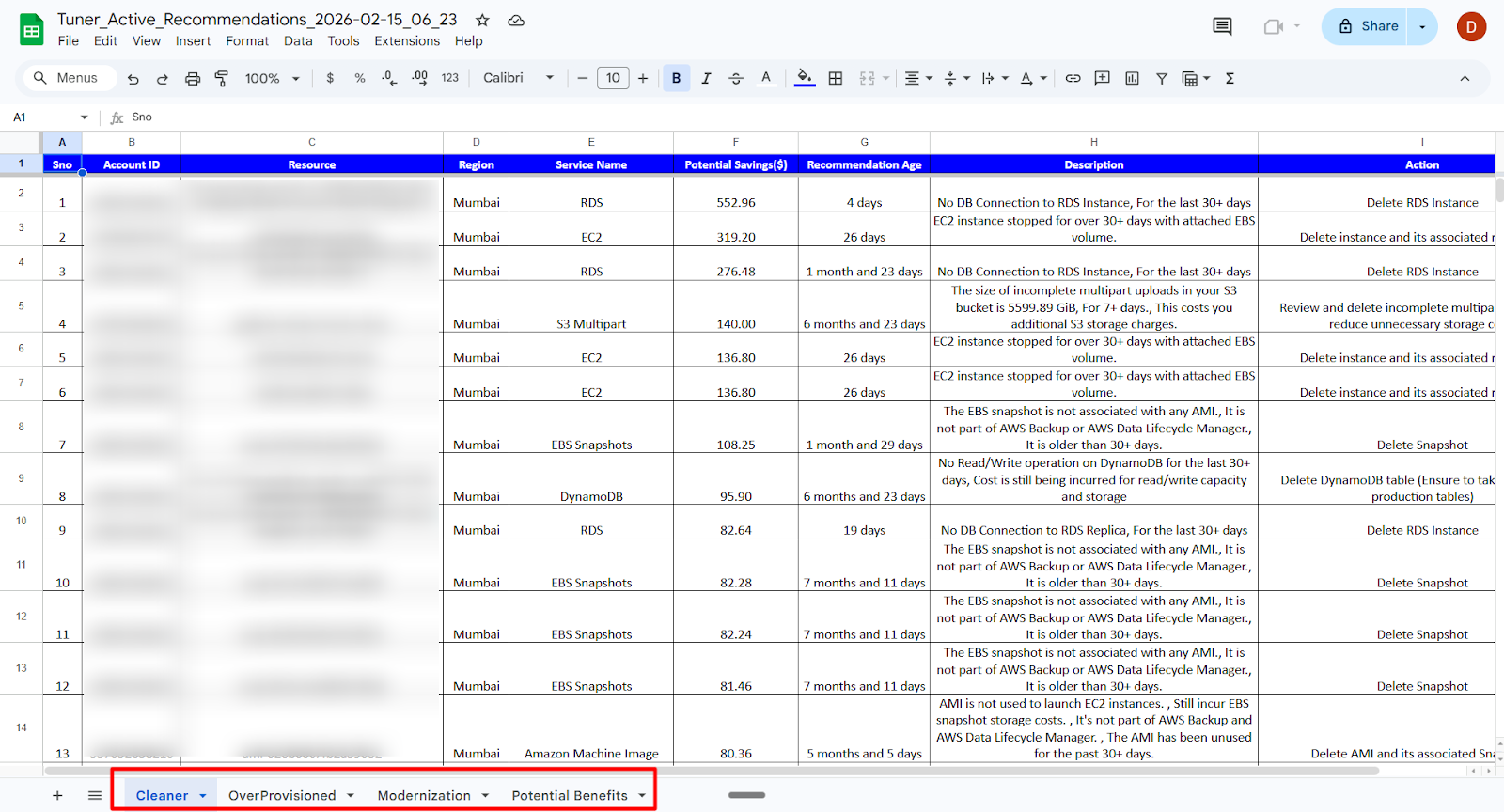 - Categories include Cleaner, Modernization, Overprovisioned, and Potential Benefit.